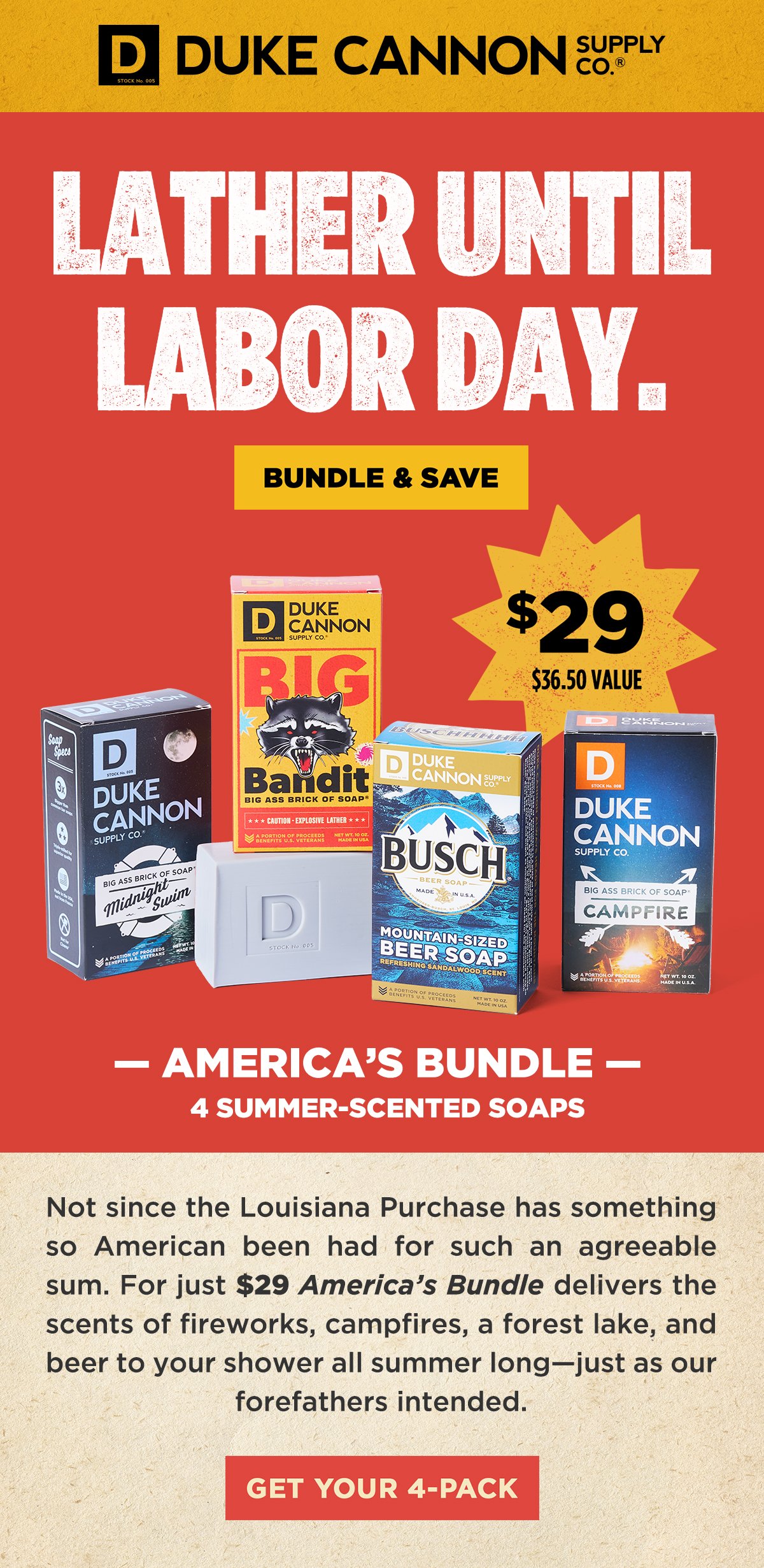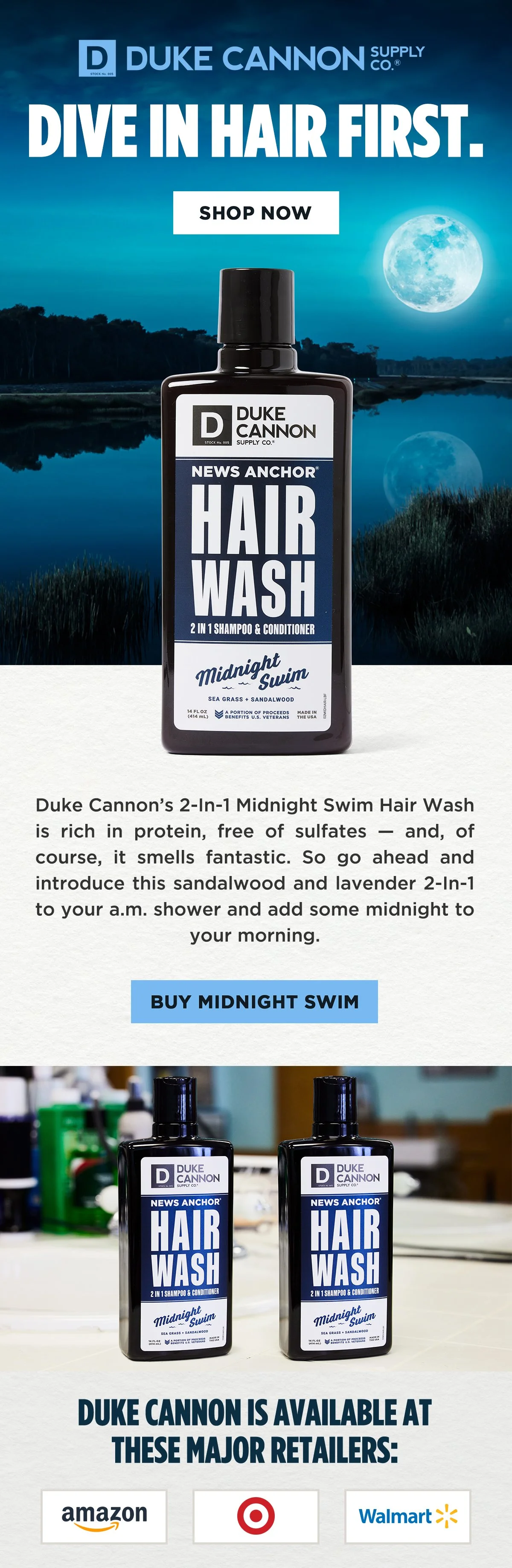 We started the year with a mini campaign trying to sell our most popular scent — Midnight Swim. In the process, I discovered that communicating an aquatic summertime scent in January is possible. To subscribe, visit duke cannon dot com, scroll to the bottom of the homepage, and sign up.